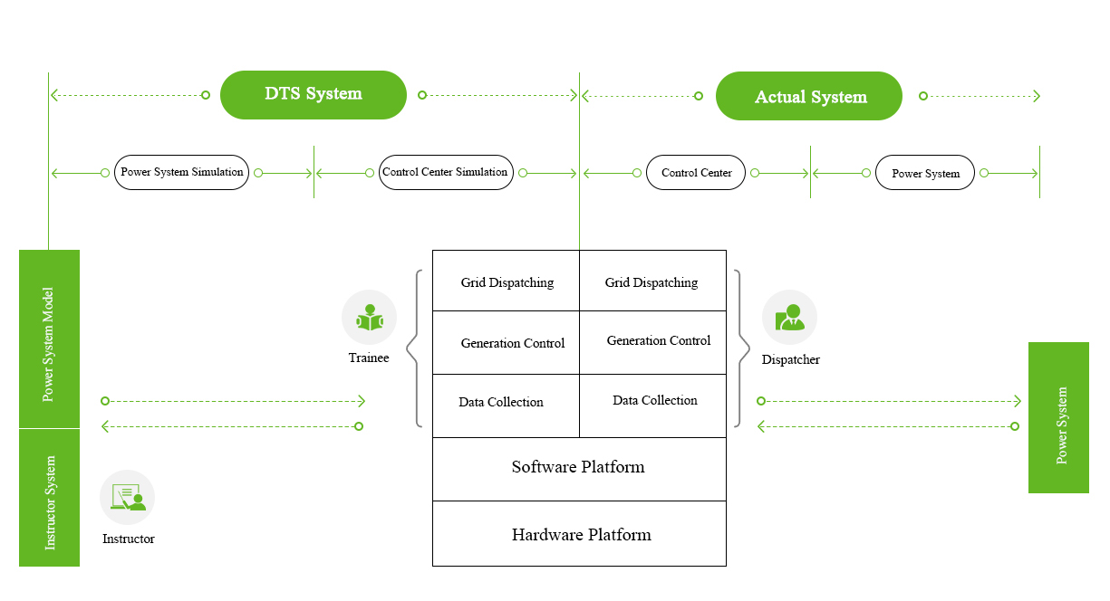 The DTS system consists of three main modules: control center simulation, power system simulation, and instructor simulation. The control center simulation highly replicates the dispatching operation environment, the power system simulation accurately simulates grid steady state, dynamic state, and fault conditions, and the instructor simulation module supports flexible training process setup, allowing customization of complex scenarios and assessment plans. The system closely mirrors the actual operating environment, offering dispatchers an immersive practical training experience. It is extensively utilized for dispatcher skill enhancement, accident simulation, and competition assessment, serving as a crucial tool to enhance dispatchers' operational capabilities.